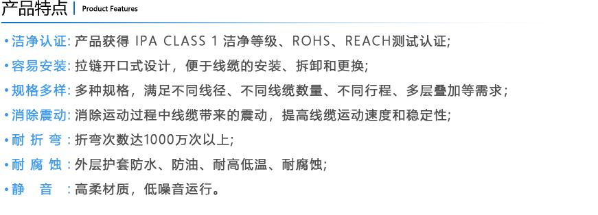易安裝式優于封閉式拖鏈結構,外層護套采用拉鏈開口式結構,便于線纜的安裝和更換。中間線纜由柔性線卡分隔和固定,提高線纜排布的速度和美觀度,同時減少線纜絕緣層的磨損,延長線纜的使用壽命。支持多層疊加,支持龍骨支撐,滿足長行程應用場景。