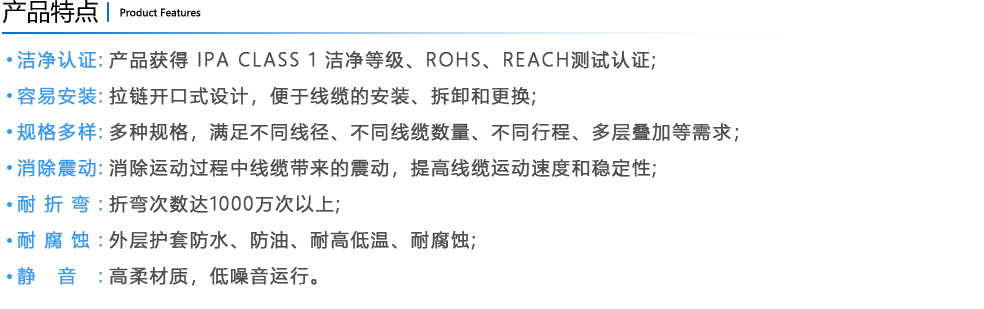 易安裝式優于封閉式拖鏈結構,外層護套采用拉鏈開口式結構,便于線纜的安裝和更換。中間線纜由柔性線卡分隔和固定,提高線纜排布的速度和美觀度,同時減少線纜絕緣層的磨損,延長線纜的使用壽命。支持多層疊加,支持龍骨支撐,滿足長行程應用場景。